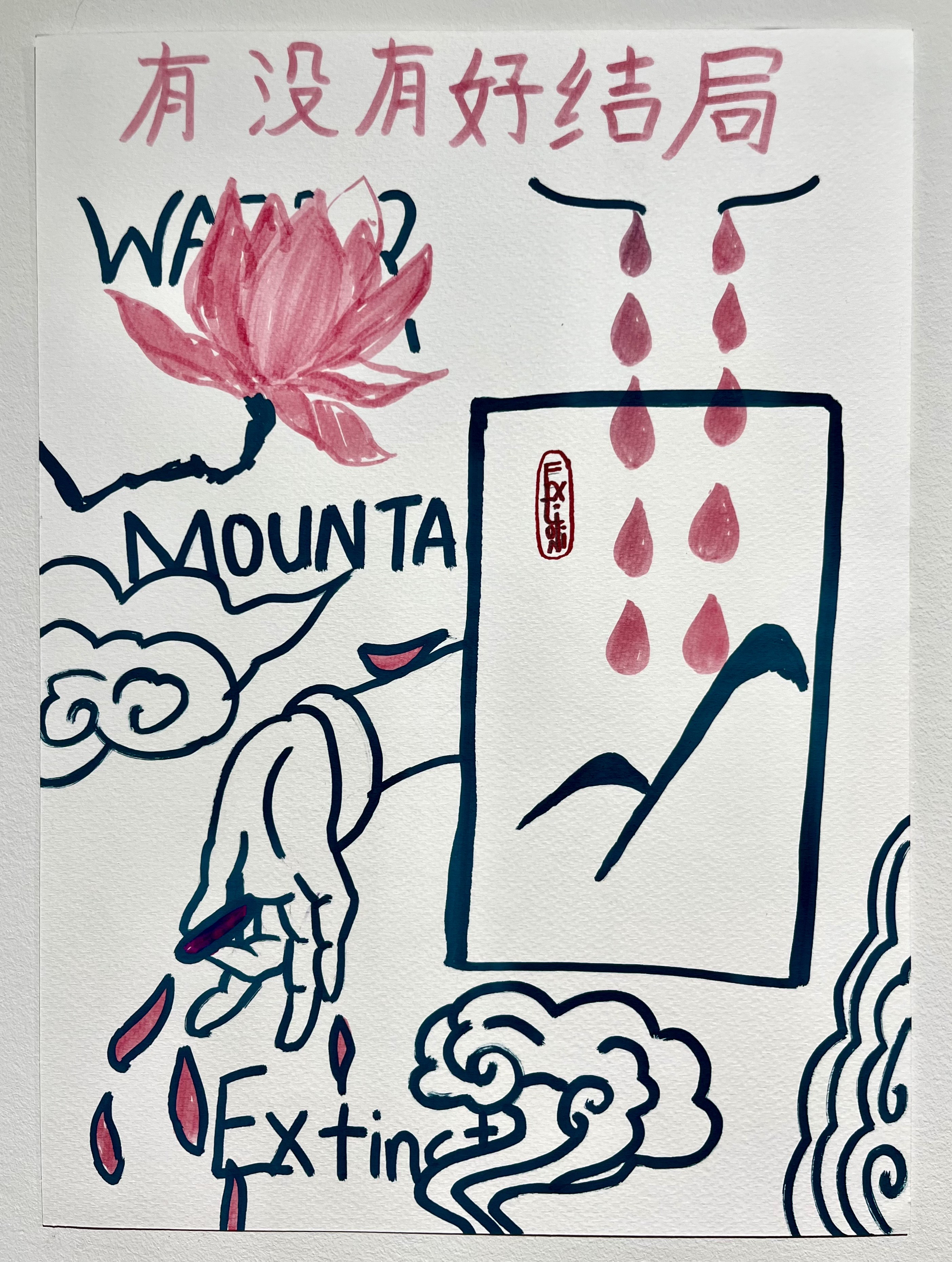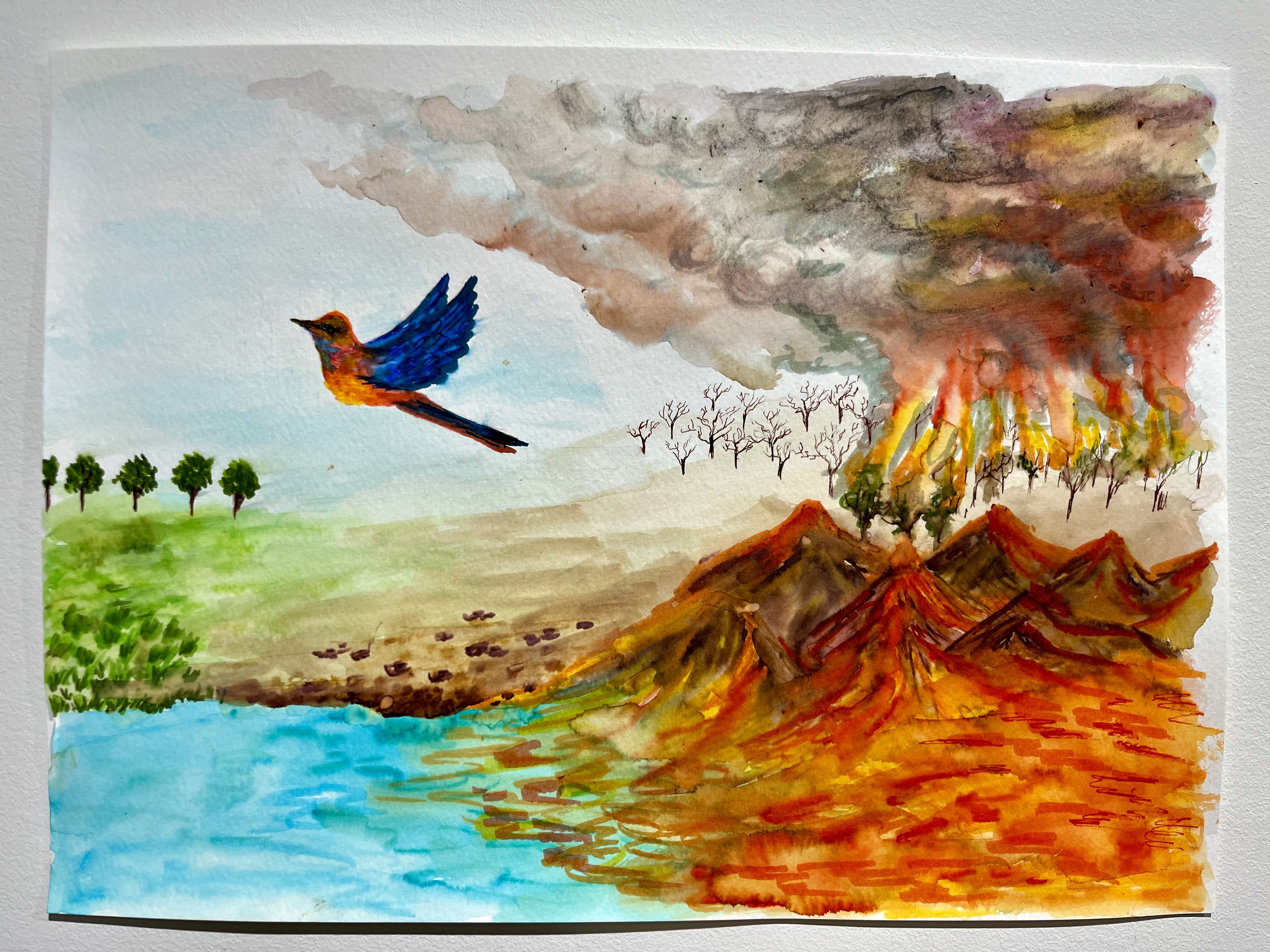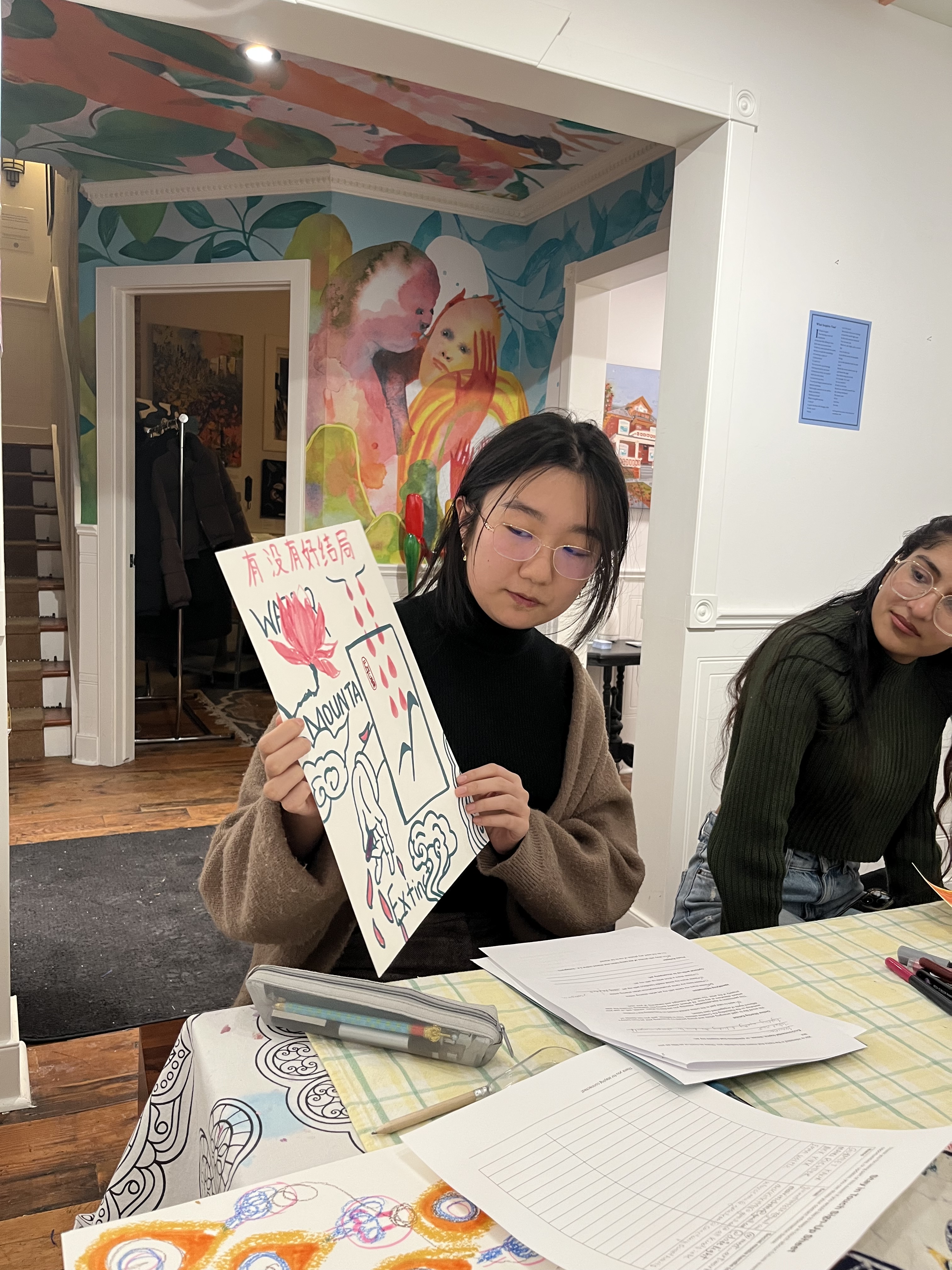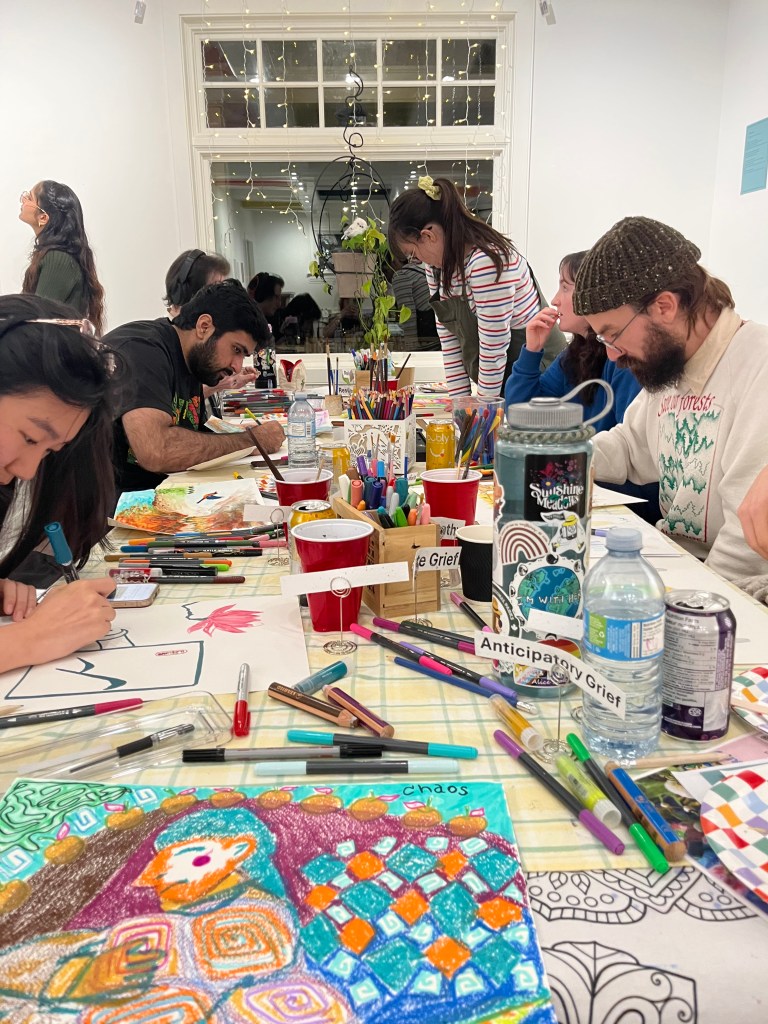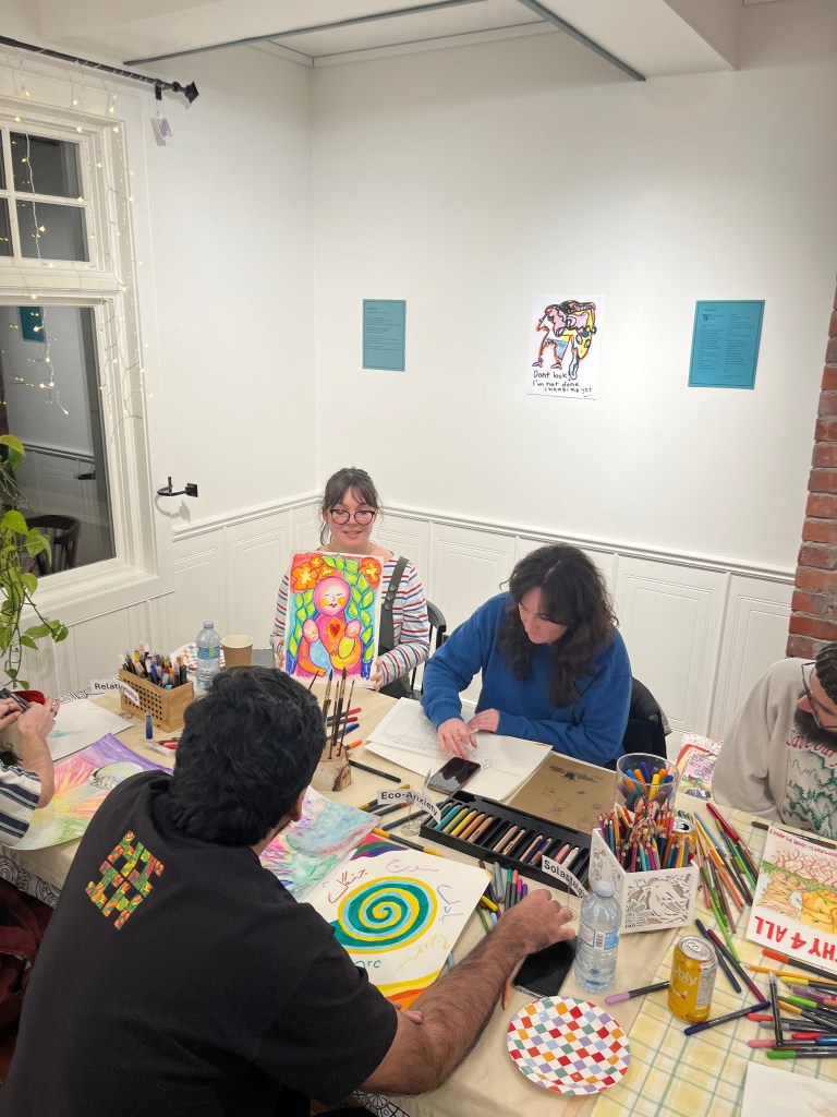 It was a delight to brush shoulders and create art side by side with fellow artists. We felt the solidarity, the shared space, and what it looks like to reimagine and recreate. Let me set the scene: a crisp soda water, all the cheese you can munch on, some chatting and some moments of quiet to tend to our art. Sometimes, the hardest part is eyeing up that blank piece of paper, but when the moment is right, the words, colours, lines, ideas, messages, calls to action, grief, and water drops flow outward. And then, the art is born.